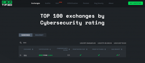 CoinGecko是加密领域的权威行情网站,提供了对加密货币市场的基本分析,包括价格、交易量、市值、社区增长、开源代码开发、重大事件和链上指标等。而CoinGecko信用分数是CoinGecko为了打击虚假的交易量数据而开发的一套算法,目的是用于衡量交易对和加密货币交易所的交易量行为。参考的指标包括:报告交易量、报告的买卖盘数据(深度和点差)、SimilarWeb的网络流量统计、整体交易活动、交易所的经营规模、交易所的API技术范围、交易所的网络安全(由 Hacken 评估)等。CoinGecko 交易所信用分评估体系的网络安全数据提供商,即是Hacken旗下安全审计业务之一的CER.live。这也足以看出Hacken在网络安全方面的权威性和独立性。在Hacken的安全审计完成后,CER的最新交易所安全测评排名显示,BiKi的CyberSecurity Score(网络安全分数)升至7.71分,截至目前,在全球100个交易平台中排名第15,创下了新高。