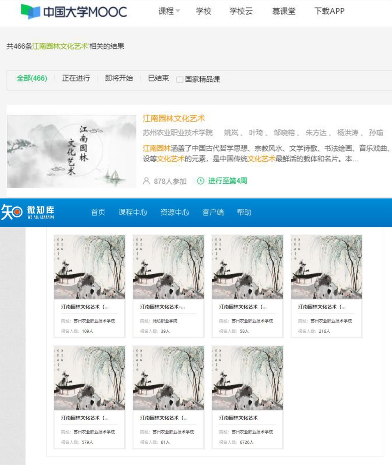 课程团队其他教师(姚岚、潘文明、孙瑜、邹晓榕、杨洪涛、沈洲)充分利用在线资源,结合线上线下课程教学模式,将江南园林文化艺术中思政的种子散播出去,让这朵“比德”之花,全面盛放于园林文化艺术课程的教学课堂。根据中国大学MOOC及微知库平台后台数据相关统计,自开课以来,《江南园林文化艺术》课程选课人数超过万人次,真正将江南园林文化艺术的思想与知识传播于青年学生的学习、生活之中,让“思政”之盐融入专业教学的美味大餐。