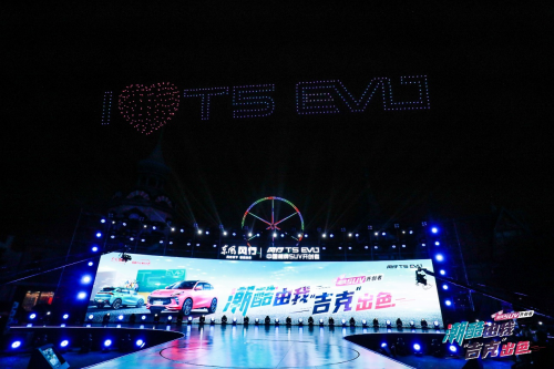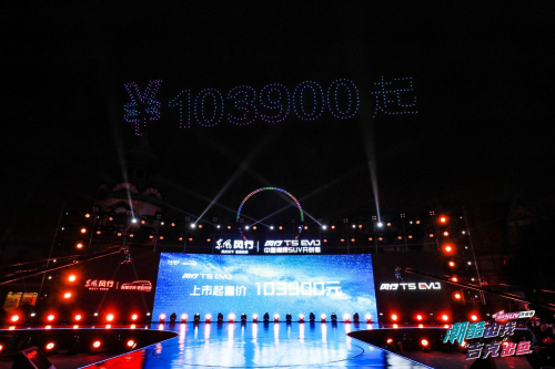 随着背景响起,空中突然闪烁起点点星光,五百架无人机编队升空,观众才骤然发现,在摩天轮的映照下,无人机组成各式各样的图案,为观众献出一场纯粹的空中视觉盛宴。只见紫荆花在空中盛开,T5 EVO 名字在闪耀黑夜,汇聚成对柳州的爱。最后,随着音乐的律动,无人机公布了T5 EVO的上市价格。可以说,在价格公布上,东风风行再次刷新了创意新高度。